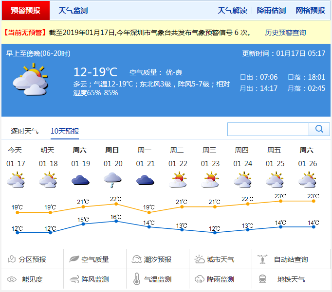 市氣象臺還發(fā)布2019年春運(yùn)天氣趨勢,預(yù)計(jì)今年春運(yùn)天氣影響與去年相當(dāng),未來45天有3次冷空氣過程,分別出現(xiàn)在1月21日、26日和2月1日 -2日前后,深圳最低氣溫10 ℃左右,天氣陰冷伴有大風(fēng),同期南方有階段性雨雪冰凍天氣。2月4日 -2月10日,無強(qiáng)冷空氣影響我市。