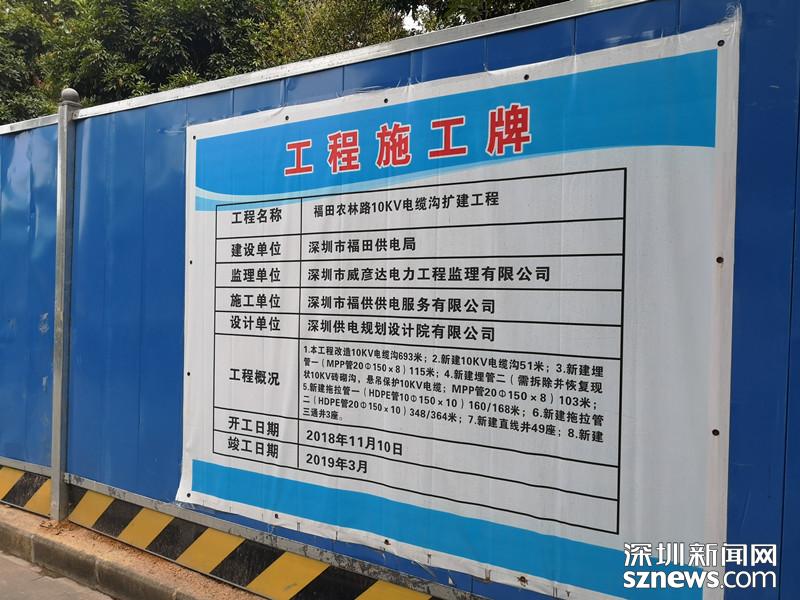 福田農(nóng)林路道路工程施工牌顯示,正在進(jìn)行電纜溝擴(kuò)建工程