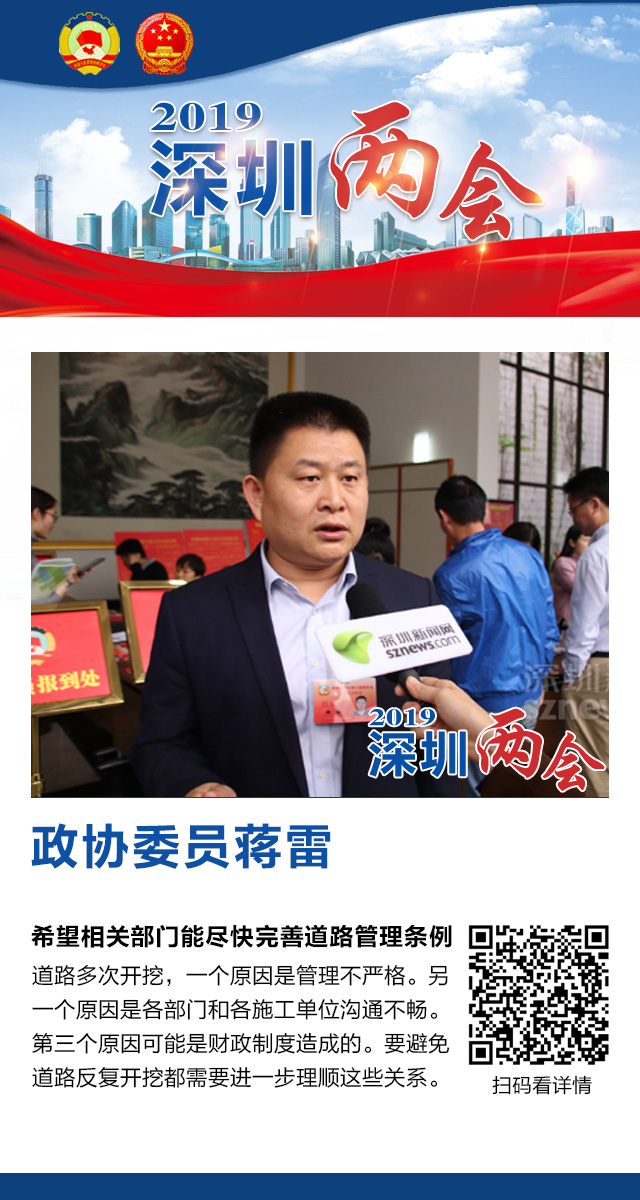深圳新聞網(wǎng)2019年1月17日訊 深圳市政協(xié)六屆五次會(huì)議1月16日開幕,記者就全市范圍內(nèi)出現(xiàn)的道路反復(fù)開挖向政協(xié)委員們征求解決良方,委員們表示,在(道路反復(fù)開挖)這件事情上,我們每個(gè)人都是受害者。只有各部門一盤棋,讓規(guī)劃更有前瞻性,讓城市建設(shè)慢下來,才能解決問題,減少給市民生活帶來的各種不便。下面讓我們一起來看看委員們的觀點(diǎn)。