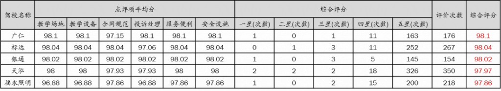 2018年第四季度駕校點評綜合評分表(節(jié)選)
