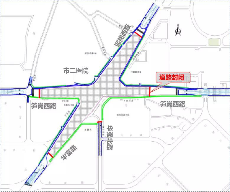 施工期間,對泥崗西路、華富路、筍崗西路、華強北路黃木崗立交部分路段進(jìn)行封閉,隔斷往來交通。