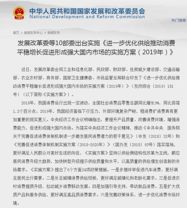 1月29日,“看不過(guò)去”的發(fā)改委就印發(fā)了《進(jìn)一步優(yōu)化供給推動(dòng)消費(fèi)平穩(wěn)增長(zhǎng)促進(jìn)形成強(qiáng)大國(guó)內(nèi)市場(chǎng)的實(shí)施方案(2019年)》