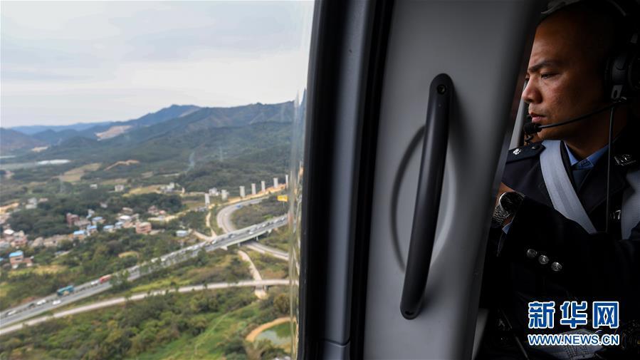 2月1日,深圳市公安局交通警察局指揮處民警劉松超在直升機(jī)上了解路面情況。2019年春運(yùn),深圳市公安局交通警察局開啟陸空立體探路模式,首次啟用直升機(jī)探路。據(jù)介紹,此次直升機(jī)探路將開展5次,屆時(shí)交警選取代表性線路從空中探察路面情況,及時(shí)為司機(jī)提供立體交通通行指引。新華社記者 毛思倩 攝