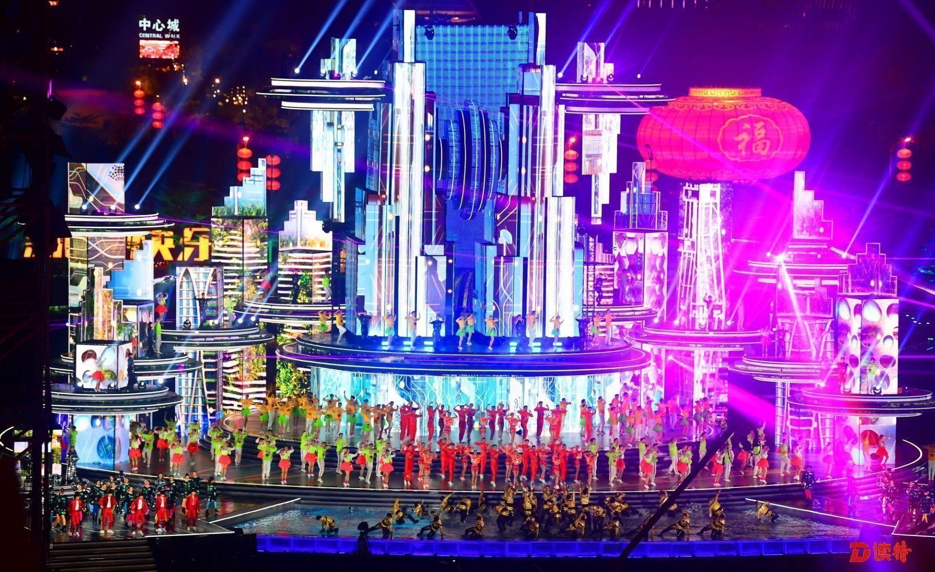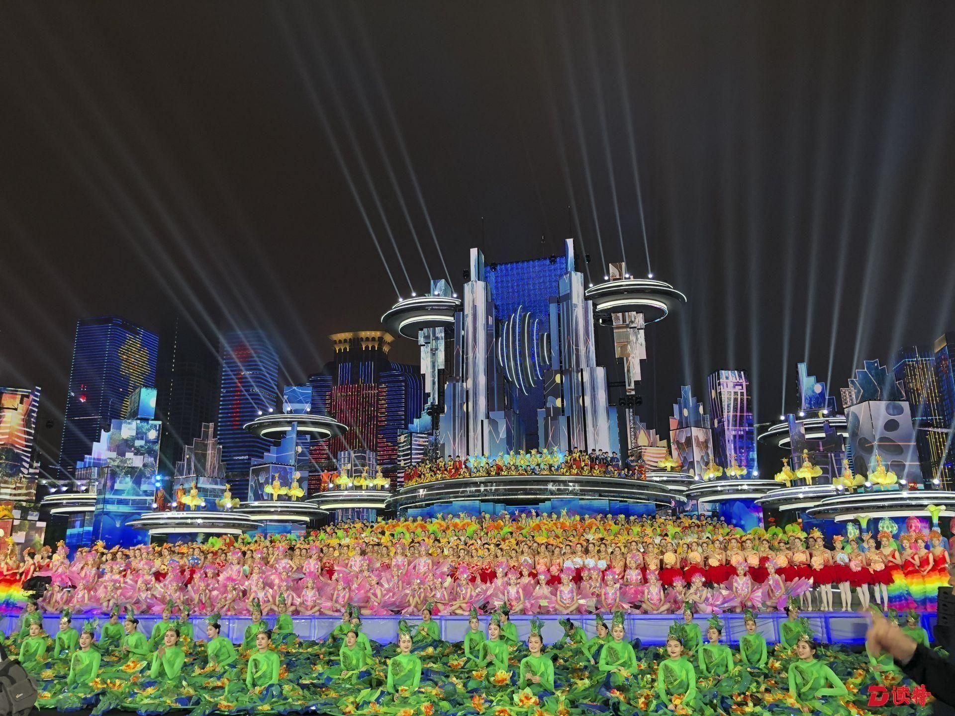 在春意盎然的南海之濱,充滿未來感的主舞臺(tái)與舞臺(tái)后方43棟樓宇燈光秀融為一體,天地為幕、光影作畫,五彩斑斕、綺麗多姿,把現(xiàn)場春晚的小舞臺(tái)融入了深圳這座城市的大舞臺(tái)。