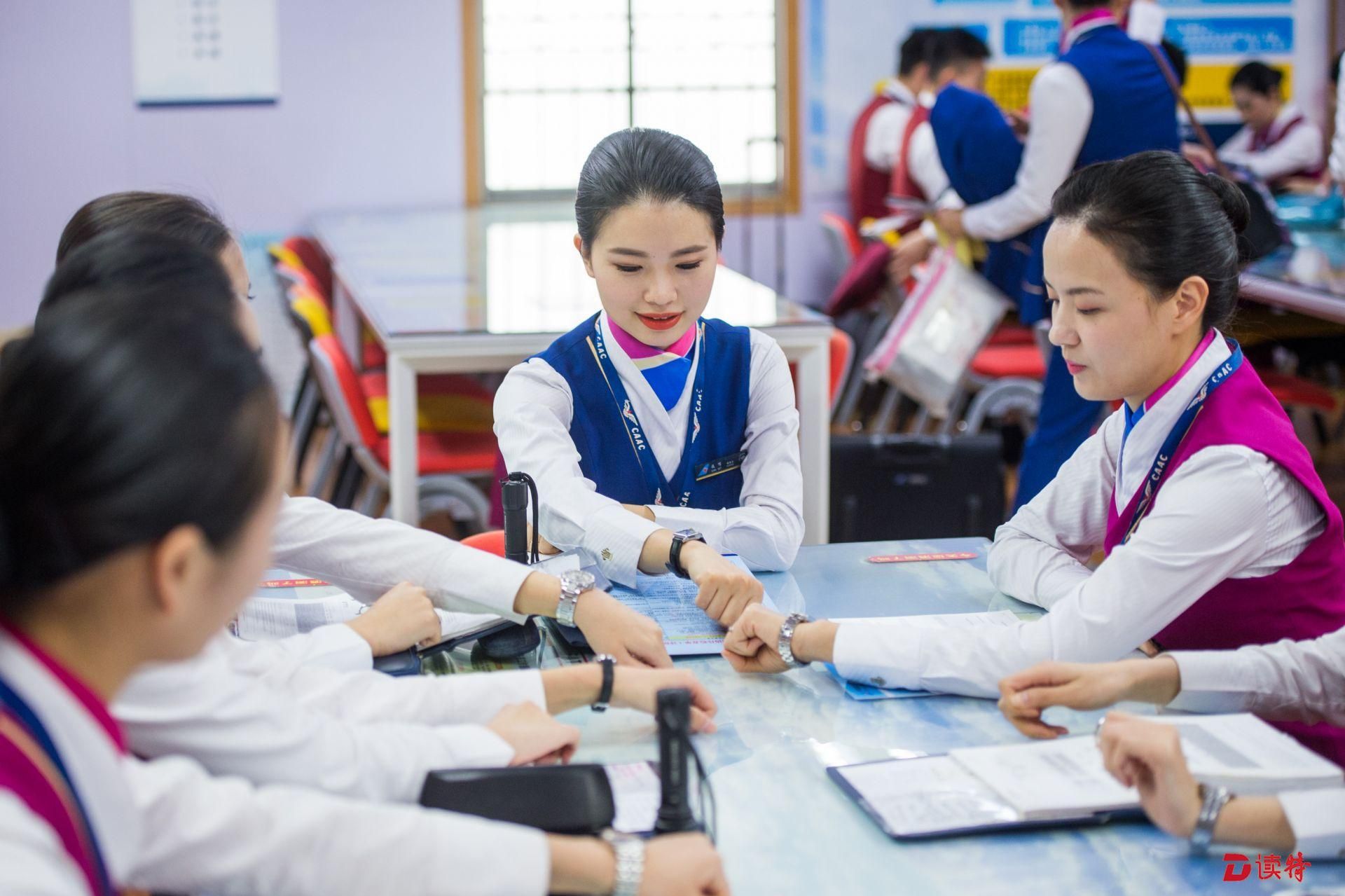 乘務員們在進行航前準備。