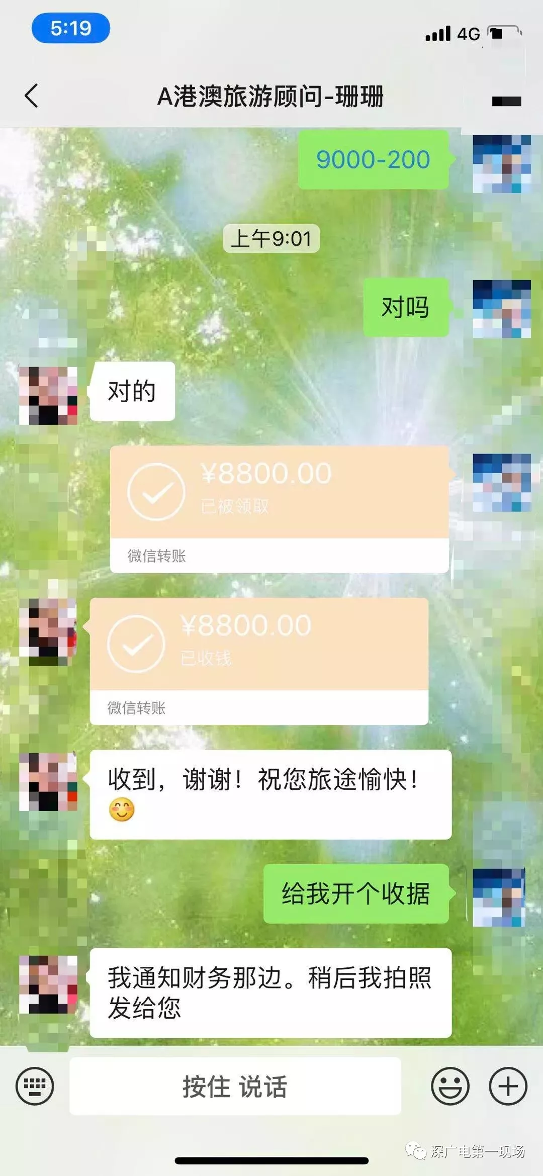 8號上午,記者先后用電話、微信等方式聯(lián)系上了,剛躲進香港海港城馬哥孛羅酒店的李女士。她說,1月31日通過百度搜索“港澳游”,與深圳北方大廈7樓的國旅,微信名叫“珊珊”的旅游顧問聯(lián)系,在支付了200元定金后,于2月6日,從北京飛抵深圳入住了“珊珊”安排的鵬威酒店,并與“珊珊”的同事簽訂了合同。李女士夫婦和他們的孩子以及父母5人,以平均1800元的團費價格,參加25-30人的5天4晚精品豪華團,赴香港澳門游玩,精品團豪華的內(nèi)容是無購物、住“四星”的香港君逸酒店。2月7日上午,他們就從口岸過關(guān)到了香港。
