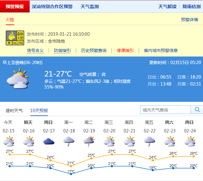 市氣象局預(yù)計(jì),15-16日深圳市可見陽光,溫暖濕潤早晚有(輕)霧,氣溫在20-28℃;17-18日天氣轉(zhuǎn)涼,沿海及高地陣風(fēng)可達(dá)8級;18日有小到中雨;19日小雨轉(zhuǎn)多云。請市民注意關(guān)注低能見度和大風(fēng)對交通和戶外作業(yè)安全的影響。