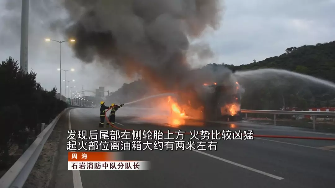 由于陳小姐及時報警,石巖消防中隊官兵在起火不久后便到達(dá)現(xiàn)場。到場后,消防立即要求還在救火的兩名司機(jī)撤離。