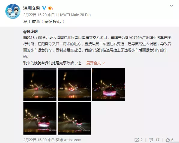 深圳新聞網(wǎng)2019年2月26日訊(記者 劉婷)據(jù)深圳交警權(quán)威發(fā)布消息,2019年2月22日下午16時(shí)22分,深圳交警收到微博網(wǎng)友舉報(bào)稱(chēng):2月21日18時(shí)55分,在北環(huán)大道南海立交路段,一輛廣州牌照小車(chē)在深圳限行時(shí)段,連續(xù)變道并壓導(dǎo)流線進(jìn)入輔道,導(dǎo)致后面兩車(chē)發(fā)生追尾事故。深圳交警立即對(duì)舉報(bào)信息進(jìn)行分析、經(jīng)過(guò)后臺(tái)系統(tǒng)查詢(xún),與被舉報(bào)廣州車(chē)牌小車(chē)車(chē)主取得聯(lián)系,但車(chē)主稱(chēng)不是其本人開(kāi)車(chē),而且人和車(chē)都在廣州,不方便來(lái)深圳處理。