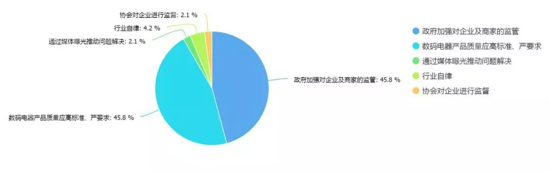 針對(duì)目前數(shù)碼家電行業(yè)中存在的相關(guān)問(wèn)題,有45.8%的消費(fèi)者建議通過(guò)政府加強(qiáng)對(duì)企業(yè)及商家的監(jiān)管,另有部分網(wǎng)民建議數(shù)碼家電類(lèi)產(chǎn)品應(yīng)該設(shè)立更高的的標(biāo)準(zhǔn),對(duì)企業(yè)應(yīng)該提出更高的要求。