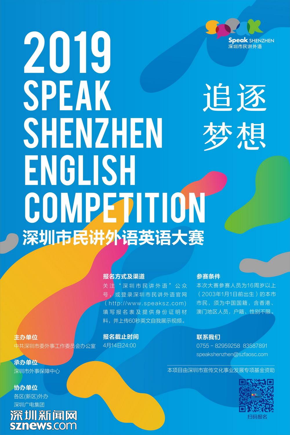 由中共深圳市委外事工作委員會(huì)辦公室主辦、深圳市外事保障中心承辦的2019“深圳市民講外語”英語大賽已正式啟動(dòng)。記者了解到,本次大賽參賽人員為16周歲以上(2003年1月1日前出生)的本市市民,須為中國國籍,含香港、澳門地區(qū)人員。有意參加比賽的市民需在4月14日24:00前關(guān)注“深圳市民講外語”公眾號(hào)或登錄深圳市民講外語官網(wǎng)(http://www.speaksz.com)填寫報(bào)名表及提供身份證證明材料,并上傳60秒英文自我展示視頻,完成報(bào)名。