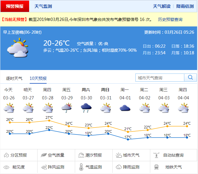 深圳新聞網(wǎng)2019年3月26日訊 今日深圳天氣多云,氣溫18-25℃,偏東風(fēng)3級,相對濕度70%-95%。預(yù)計27-28日可見陽光,早晚有輕霧,氣溫逐日回升;29-31日冷空氣影響,深圳市轉(zhuǎn)陣雨或雷陣雨,氣溫下降,天氣轉(zhuǎn)涼。