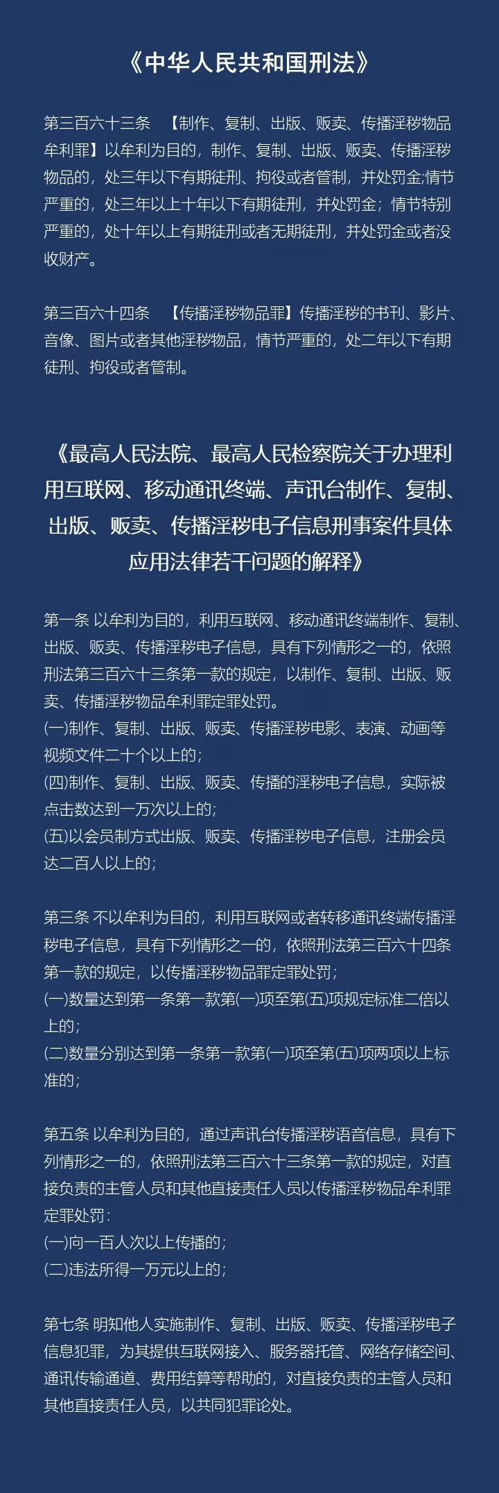 我國(guó)《刑法》規(guī)定了對(duì)傳播淫穢物品牟利罪、傳播淫穢物品罪的處罰,而最高法、最高檢2004年9月出臺(tái)的《關(guān)于辦理利用互聯(lián)網(wǎng)、移動(dòng)通信終端、聲訊臺(tái)制作、復(fù)制、出版、販賣、傳播淫穢電子信息的刑事案件具體應(yīng)用法律若干問(wèn)題的解釋》,又對(duì)此類犯罪認(rèn)定做了詳細(xì)的解釋。