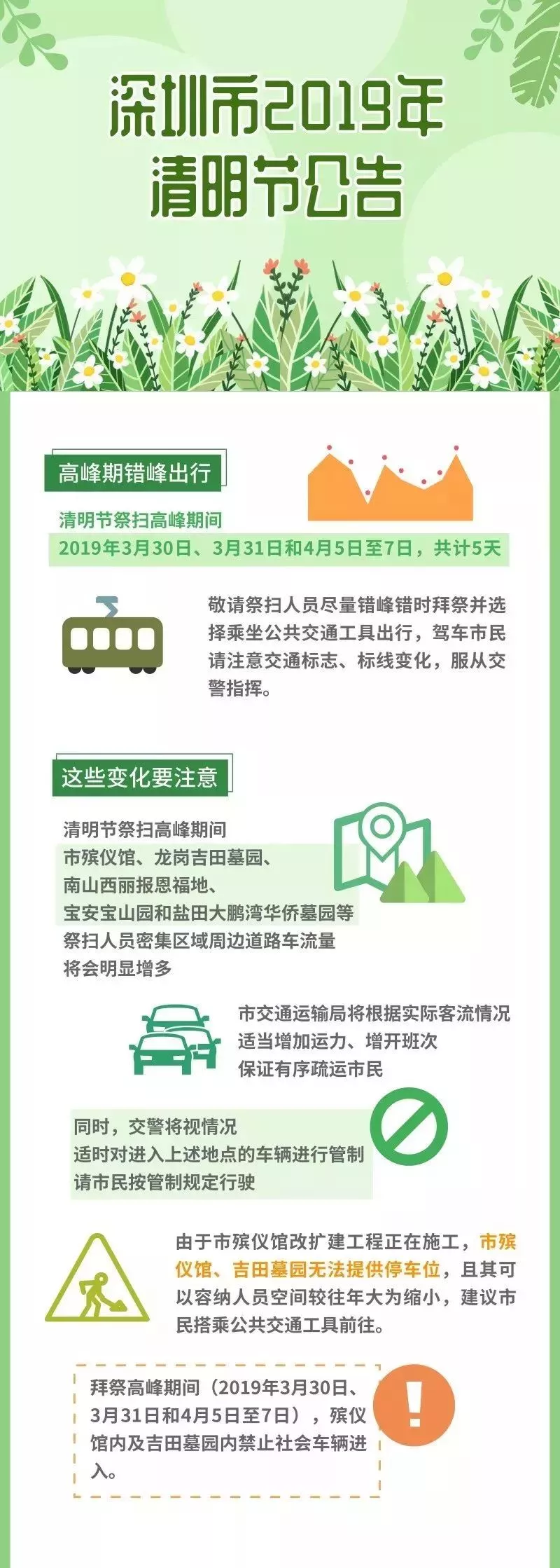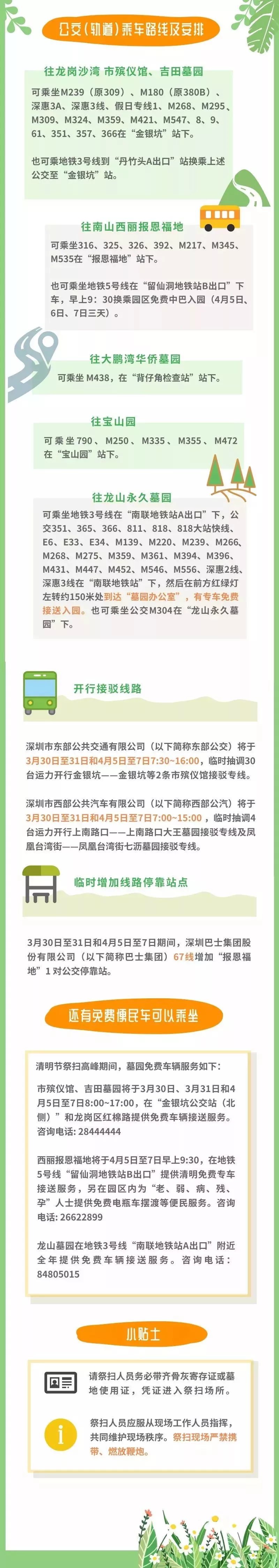 交警部門將視情況對上述地點進(jìn)行交通管制,為滿足市民朋友出行祭掃需要,除了給大家準(zhǔn)備出行指引外還將開行墓園接駁專線、增加停靠站、增加運力請大家文明出行、綠色出行。