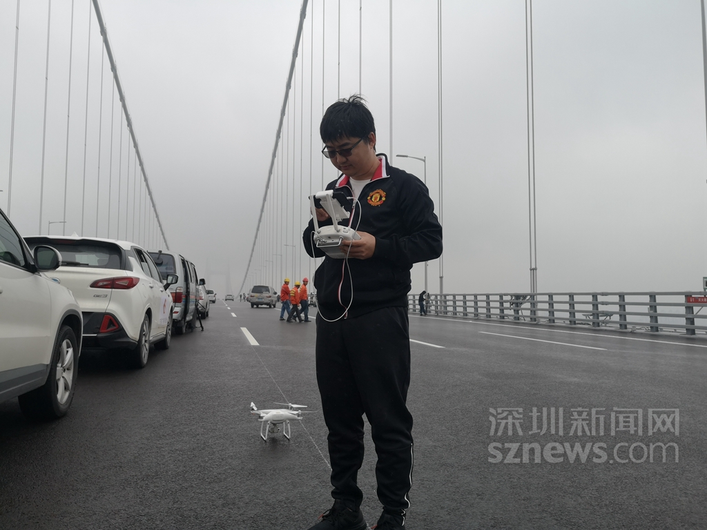 深圳新聞網(wǎng)記者齊釗遠在橋面上調(diào)試無人機,準備航拍虎門二橋(現(xiàn)名南沙大橋)