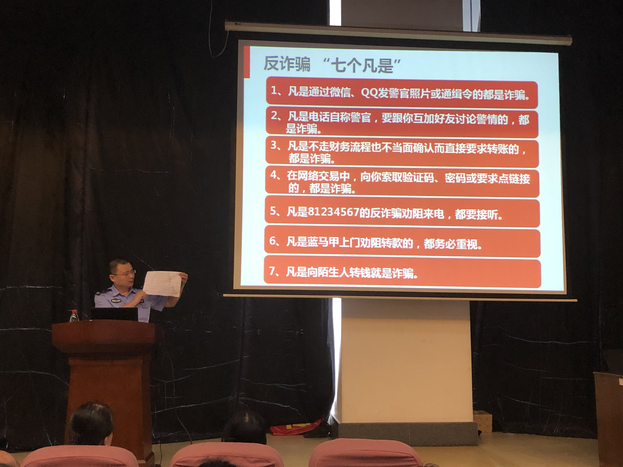 4月12日下午,惠杰副所長、社區(qū)民警黃旭波、孫立波在財(cái)富廣場小禮堂開展香蜜湖“反詐騙課堂”第一場,向財(cái)富廣場各公司負(fù)責(zé)人、財(cái)務(wù)人員開展反詐騙宣傳,“反詐騙宣傳”PPT包含反詐騙工作面臨的嚴(yán)峻形式、電信詐騙的常見手段、各類案例及宣傳視頻、電信詐騙的防范要點(diǎn)、以及社區(qū)民警的微信二維碼名片等等。此次宣傳借用大廈的會議室、物業(yè)單位的小禮堂,將本樓的商戶、公司集中在一起,形成區(qū)域效應(yīng);突出重點(diǎn)人員,主要針對單位負(fù)責(zé)人、財(cái)務(wù)人員,切實(shí)提高居民自我防范意識。