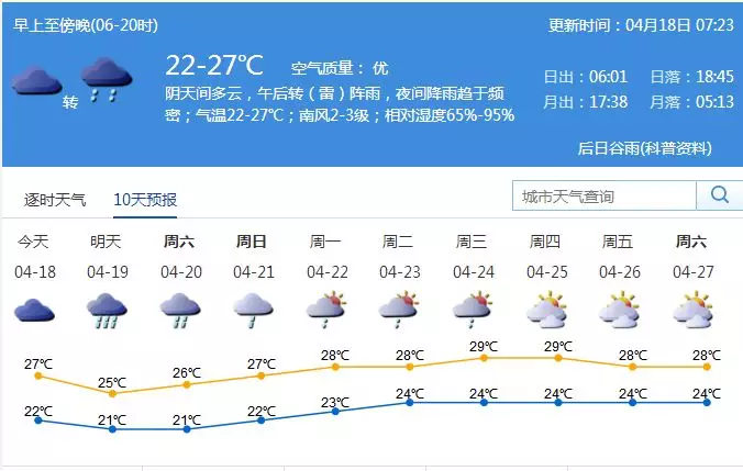 深圳新聞網(wǎng)2019年4月18日訊 今日天氣:陰天間多云,午后轉(zhuǎn)(雷)陣雨,夜間降雨趨于頻密;氣溫22-27℃