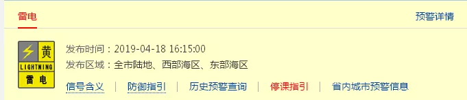 深圳市氣象臺(tái)于2019年04月18日16時(shí)15分在全市發(fā)布雷電預(yù)警,預(yù)計(jì)30-60分鐘內(nèi)全市將逐漸自西向東轉(zhuǎn)雷陣雨,按照防御預(yù)案停止戶外易燃易爆危險(xiǎn)作業(yè),并加強(qiáng)?;瘓?chǎng)所安全管理,正值下班放學(xué)高峰期,請(qǐng)注意防御。