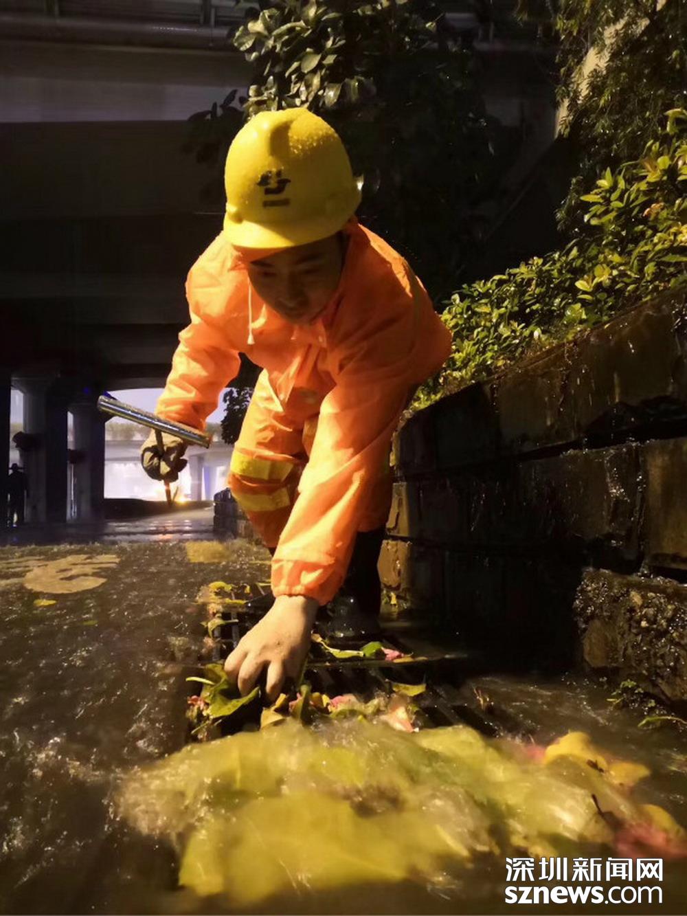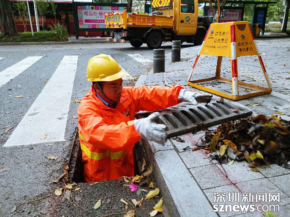 福田區(qū)中心二路和福華四路交界處東南角,工作人員正打開雨水篦子加速排水