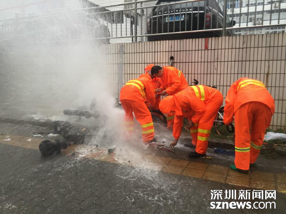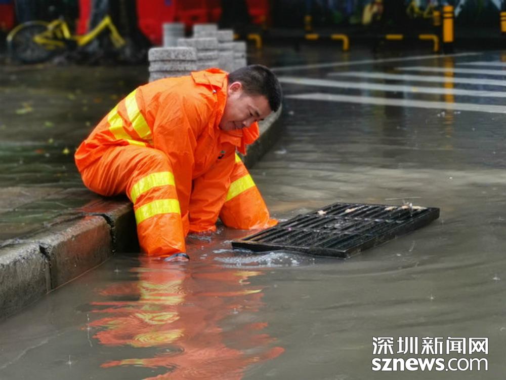 福田區(qū)深南路證券大廈前,工作人員正打開雨水篦子加速排水