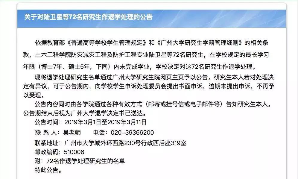 72名研究生在學校規(guī)定的最長學習年限(博士7年、碩士5年,下同)內未完成學業(yè),學校決定對這72名研究生作退學處理。