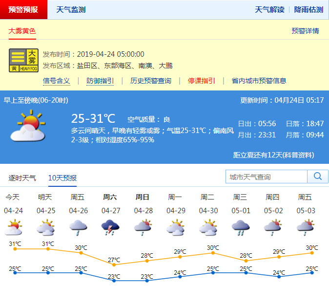 深圳新聞網(wǎng)2019年4月24日訊 深圳市氣象局預計24日多云,中午前后悶熱,早晚有輕霧或霧,氣溫25-31℃;25-26日多云,局地有短時陣雨或雷陣雨;26日夜間至28日有一次雷雨過程,局地有大到暴雨。