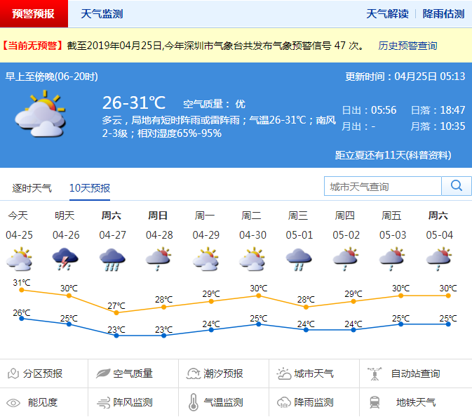 深圳新聞網(wǎng)2019年4月25日訊 本周以來,陽光充足,氣溫逐日上升,不過隨著“五一”假期的臨近,強降雨也在悄悄靠近。據(jù)市氣象臺預測,25日我市多云,中午前后炎熱,有短時陣雨或雷陣雨,早晚東部有大霧。26-27日有大雨到暴雨,伴短時強降水、8級左右短時大風和雷暴。28-30日降雨減弱,有陣雨或雷陣雨;展望“五一”假期前期還有一次強降雨過程。