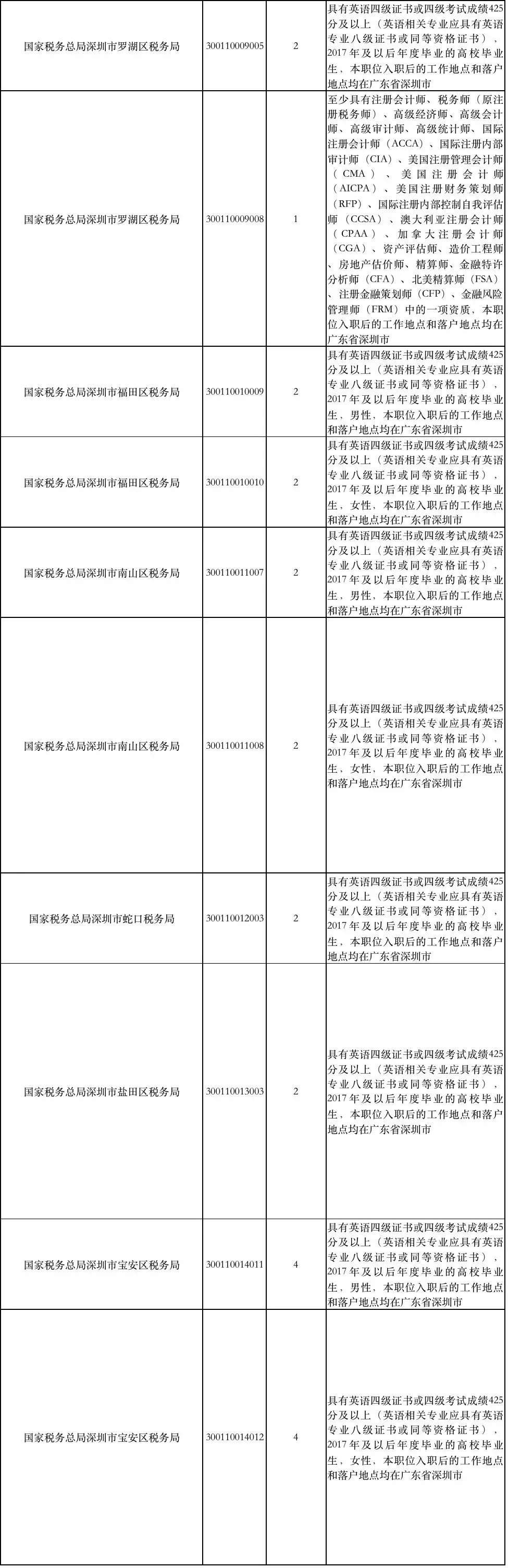 國家稅務(wù)總局深圳市稅務(wù)局補充錄用職位簡表: