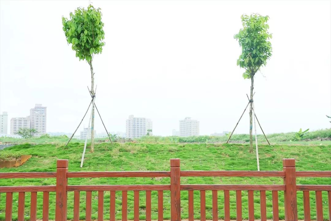 綠油油的草坪與仿木色欄桿的搭配