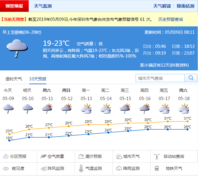 市氣象局預(yù)計(jì),9日深圳以陰天天氣為主,有中到大雨,局部暴雨;氣溫在19-23℃;沿海、高地和海區(qū)最大陣風(fēng)6-7級(jí)。10-11日以多云天氣為主,有短時(shí)陣雨。12日起多云,氣溫明顯回升。