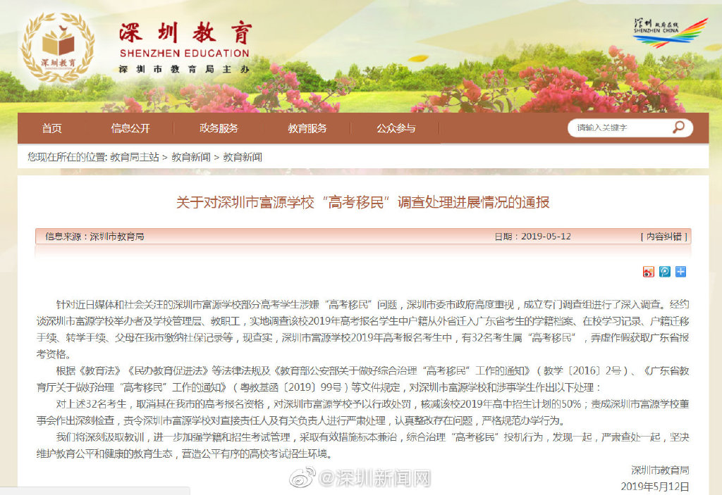 針對近日媒體和社會關注的深圳市富源學校部分高考學生涉嫌“高考移民”問題,深圳市委市政府高度重視,成立專門調(diào)查組進行了深入調(diào)查。經(jīng)約談深圳市富源學校舉辦者及學校管理層、教職工,實地調(diào)查該校2019年高考報名學生中戶籍從外省遷入廣東省考生的學籍檔案、在校學習記錄、戶籍遷移手續(xù)、轉學手續(xù)、父母在我市繳納社保記錄等,現(xiàn)查實,深圳市富源學校2019年高考報名考生中,有32名考生屬“高考移民”,弄虛作假獲取廣東省報考資格。