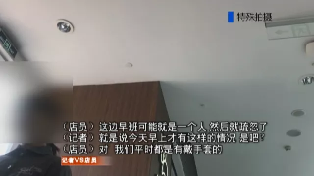 該店的同事趕緊進到廚房進行提醒,這名店員隨后也急忙戴上了手套!