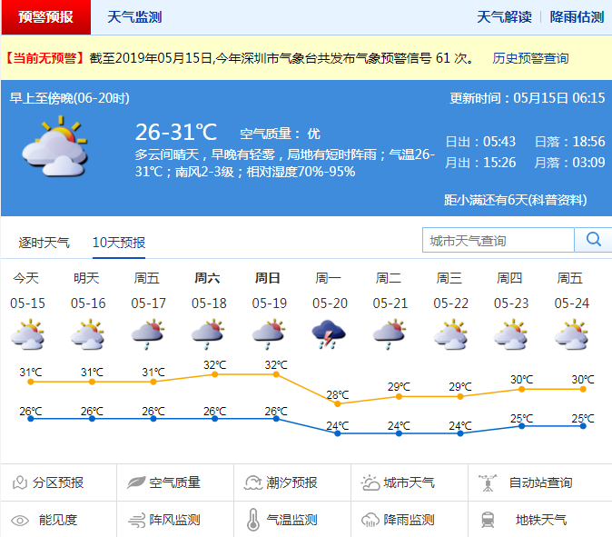預計未來幾天持續(xù)炎熱,其中,15日深圳以多云天氣為主,局地有短時陣雨,早晚有輕霧,氣溫26℃至31℃;16日至19日持續(xù)炎熱,最高氣溫達32℃,以多云為主,局地有陣雨或雷陣雨;20日前后將有一次明顯降雨過程。