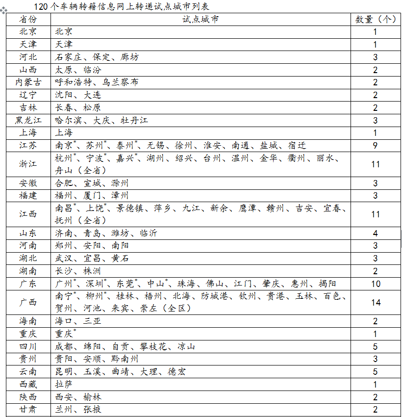 4.?dāng)U大車輛轉(zhuǎn)籍信息網(wǎng)上轉(zhuǎn)遞試點(diǎn)。在原有15個(gè)試點(diǎn)城市的基礎(chǔ)上,進(jìn)一步擴(kuò)大非營運(yùn)小微型載客汽車檔案電子化網(wǎng)上轉(zhuǎn)遞試點(diǎn),在直轄市、省會(huì)市、自治區(qū)首府市、計(jì)劃單列市全部推行,同時(shí)各?。▍^(qū))至少再選擇1至2個(gè)城市推行。對(duì)機(jī)動(dòng)車在試點(diǎn)城市之間轉(zhuǎn)籍的,申請(qǐng)人可以直接到車輛遷入地車輛管理所申請(qǐng)并辦理,無需再回遷出地驗(yàn)車、提取紙質(zhì)檔案。