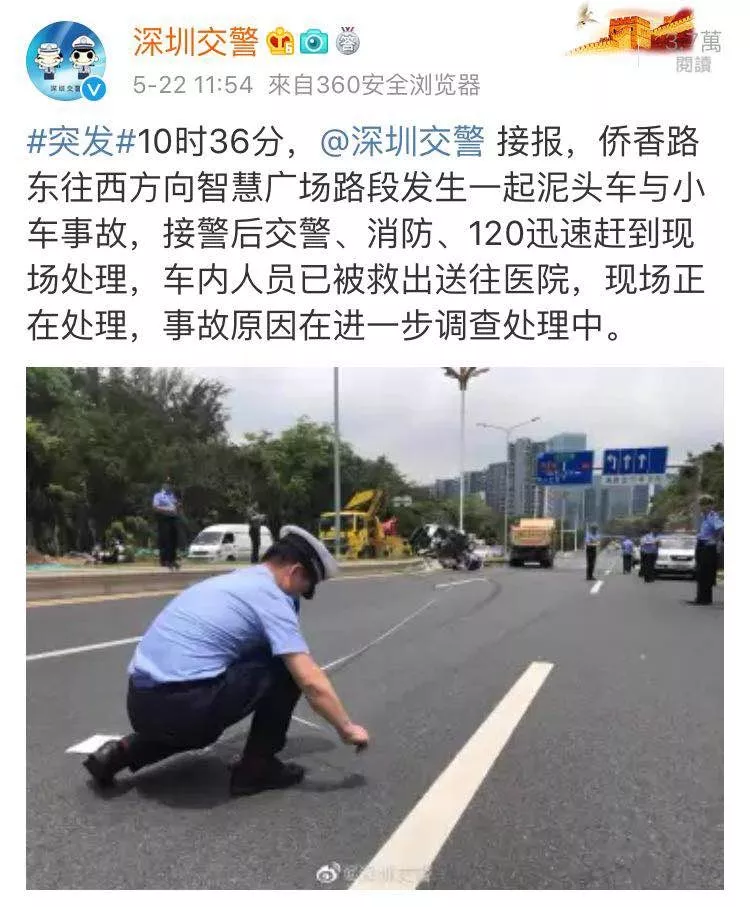 據(jù)@深圳交警官方微博消息,10時36分,僑香路東往西方向智慧廣場路段發(fā)生一起泥頭車與小車事故,接警后交警、消防、120迅速趕到現(xiàn)場處理,車內(nèi)人員已被救出送往醫(yī)院,現(xiàn)場正在處理,事故原因在進(jìn)一步調(diào)查處理中。