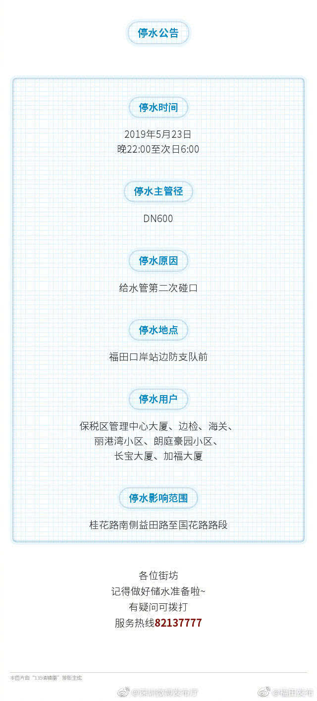 溫馨提醒!今天晚上22:00至明日6:00,福田區(qū)保稅區(qū)管理中心大廈、邊檢、海關(guān)、麗港灣小區(qū)、朗庭豪園小區(qū)、長(zhǎng)寶大廈、加福大廈等區(qū)域?qū)⒂?jì)劃停水,各位街坊記得做好儲(chǔ)水準(zhǔn)備??!戳下圖了解更多停水停電資訊!