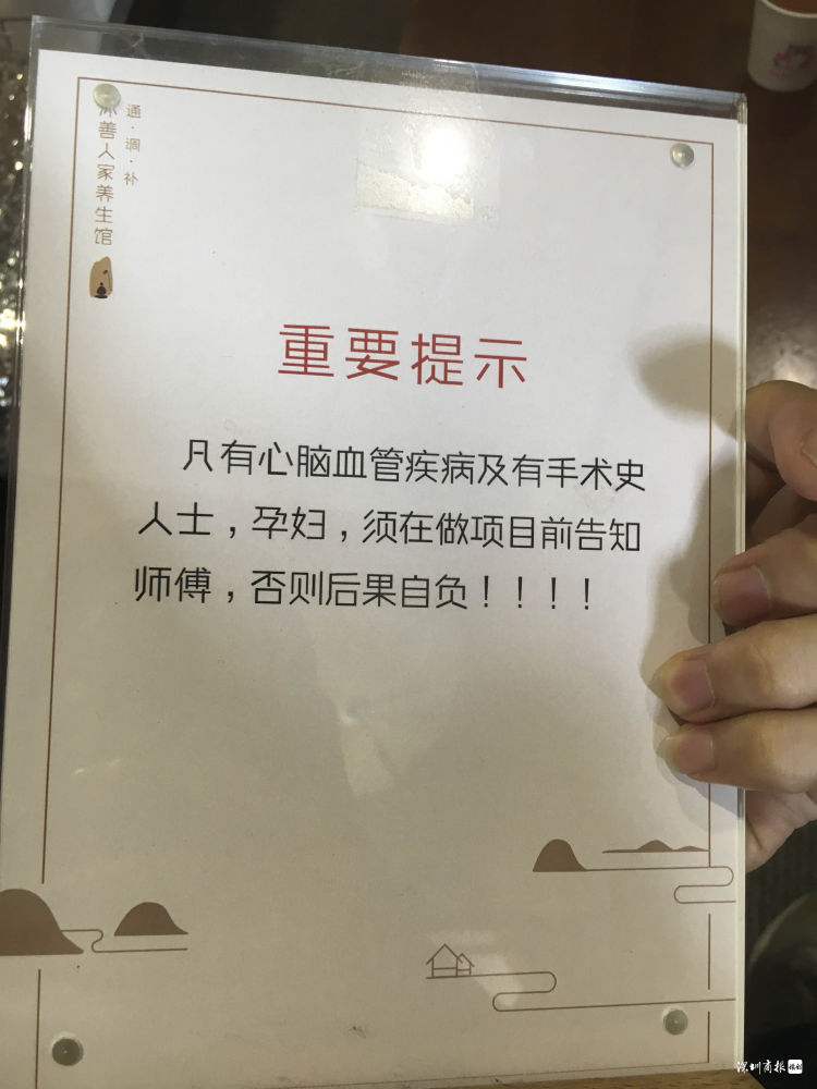 5月22日,讀創(chuàng) /深圳商報記者來到了該養(yǎng)生館,該養(yǎng)生館仍在正常營業(yè)。記者發(fā)現(xiàn),店家在桌子上擺放了重要提示:凡有心腦血管疾病及有手術(shù)史人士、孕婦,須在做項目前告知師傅,否則后果自負!李小姐告訴記者,這是她母親出事后才增加的,正骨等項目已被店家從美團上撤下。