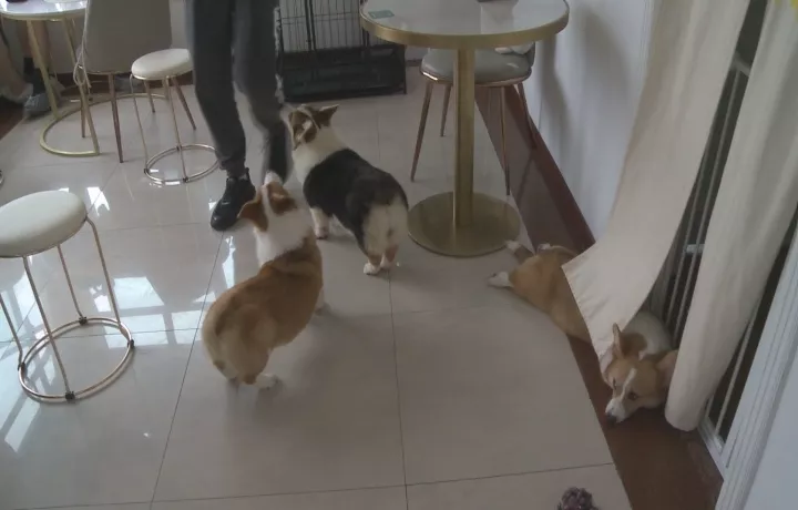 根據(jù)小區(qū)業(yè)主指引,記者來到小區(qū)13層的一家狗狗咖啡廳,可以看到,門口并沒有任何招牌,不過大門打開后,可以看到經(jīng)營(yíng)場(chǎng)所有兩層,里面有餐桌凳子,有收銀臺(tái),另外還有四只小型寵物犬。