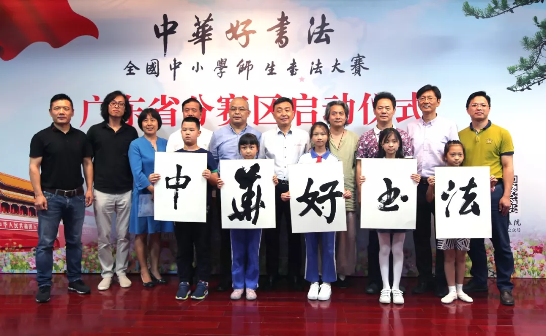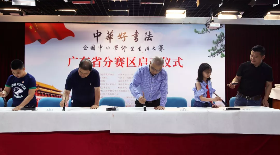 “中華好書(shū)法”全國(guó)中小學(xué)師生書(shū)法大賽廣東賽區(qū)組委會(huì)執(zhí)行副主任趙永金和教師代表趙軍、崔占海,學(xué)生代表劉子文、李唐心上臺(tái)開(kāi)筆