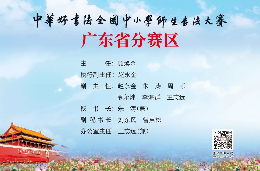 啟動(dòng)儀式宣布成立“中華好書(shū)法”全國(guó)中小學(xué)師生書(shū)法大賽廣東省分賽區(qū)組委會(huì)、評(píng)委會(huì)和秘書(shū)處等工作機(jī)構(gòu)。顧煥金任廣東省分賽區(qū)組委會(huì)主任,趙永金任廣東省分賽區(qū)組委會(huì)執(zhí)行副主任,朱濤、羅永煒、周樂(lè)、李海群、王志遠(yuǎn)任廣東省分賽區(qū)組委會(huì)副主任,朱濤兼廣東省分賽區(qū)組委會(huì)秘書(shū)長(zhǎng),劉東風(fēng)、曾啟松任廣東省分賽區(qū)組委會(huì)副秘書(shū)長(zhǎng),王志遠(yuǎn)兼任廣東省分賽區(qū)組委會(huì)辦公室主任。