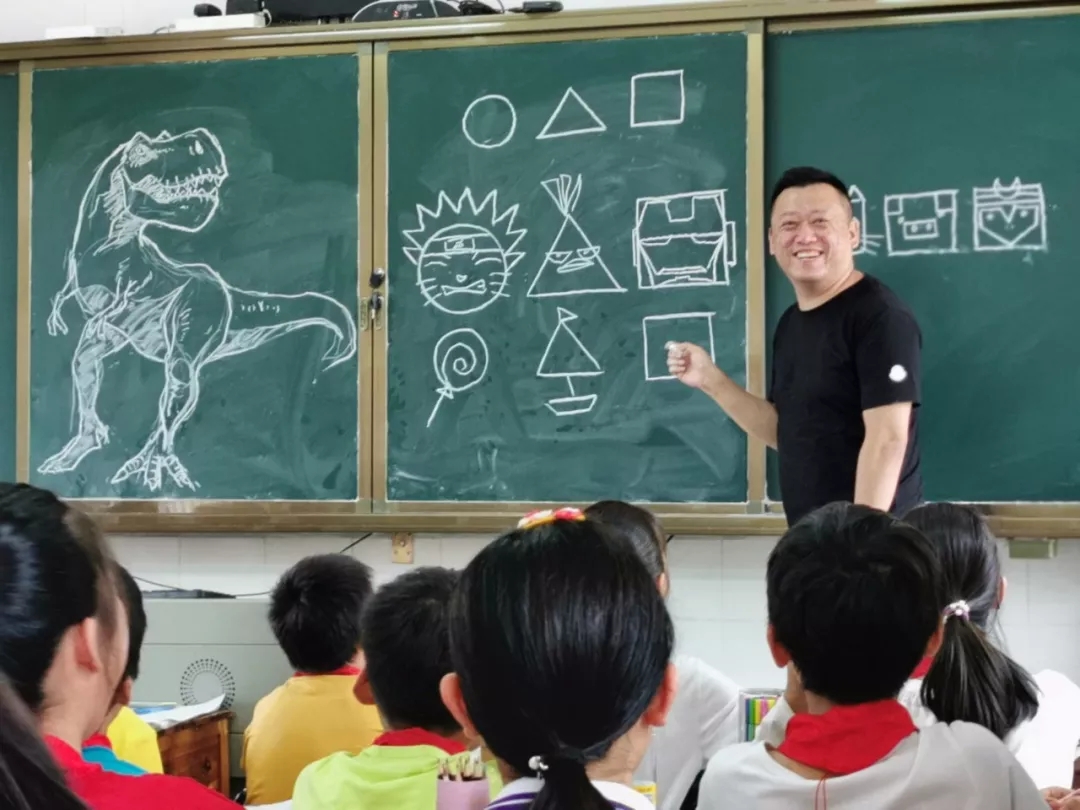 給同學(xué)們上美術(shù)課的是總社的美術(shù)編輯李新義老師。上課前,李老師一言不發(fā)地站在講臺上,拿起粉筆就在黑板上畫畫。下面的同學(xué)們一頭霧水地看著老師,七嘴八舌地猜他在畫什么: