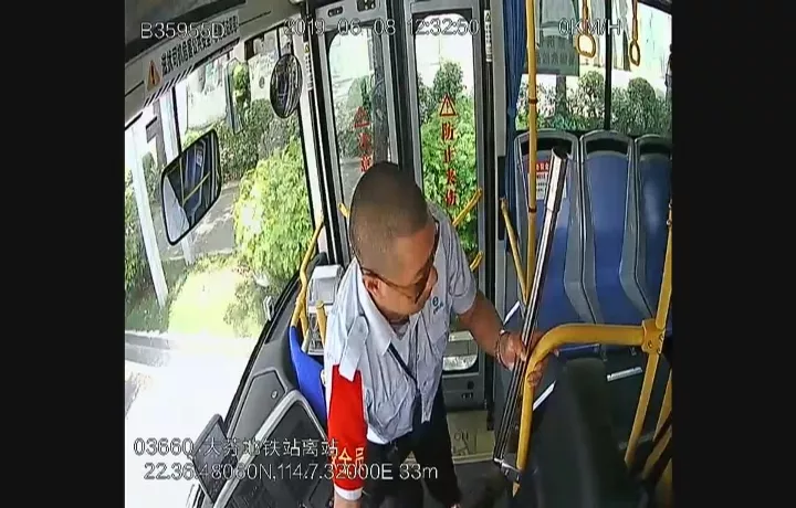 監(jiān)控顯示:6月8日中午12點(diǎn)27分左右,司機(jī)熊師傅正常駕駛車(chē)輛,這時(shí)身旁的一名穿黑色上衣的男乘客突然跌倒在地。熊師傅發(fā)現(xiàn)后,急忙將車(chē)輛行駛到安全地帶停放,并向男乘客詢問(wèn)情況。