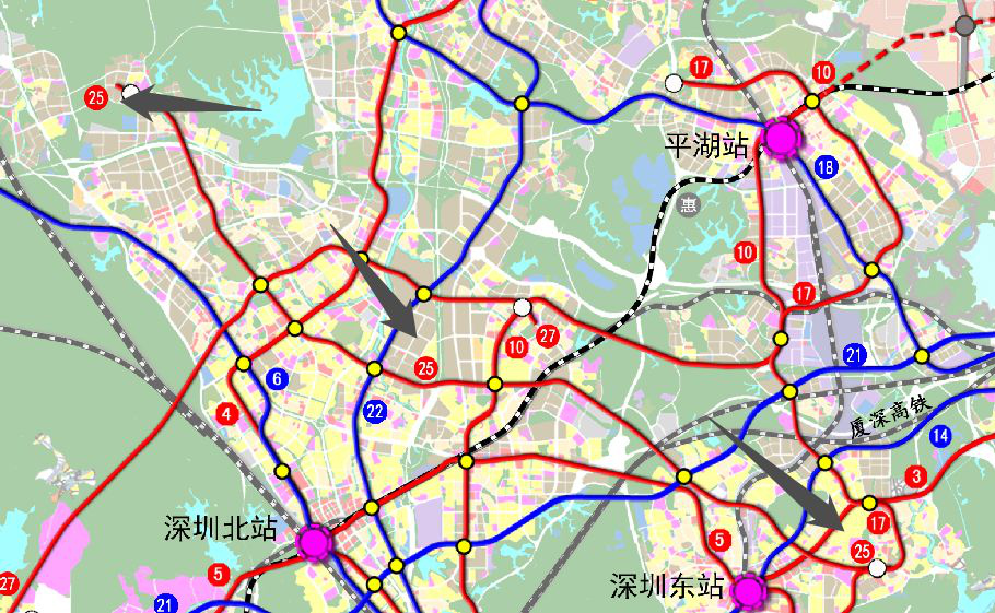 根據(jù)《深圳市城市軌道線網(wǎng)規(guī)劃(2016-2030)》,25號線定位為支撐深圳市北部發(fā)展帶的普速服務(wù)線。線路聯(lián)系龍華、坂田、布吉等橫向二圈層片區(qū),增加沿線片區(qū)的軌道覆蓋率,加強(qiáng)橫向聯(lián)系,同時與5條縱向軌道快、干線換乘,喂給客流,完善軌道線網(wǎng)結(jié)構(gòu)。