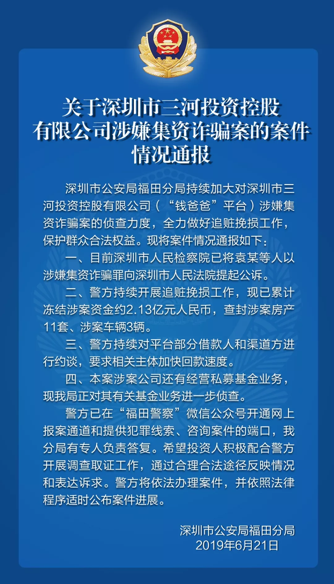 關(guān)于深圳市三河投資控股有限公司涉嫌集資詐騙案的案件情況通報(bào)