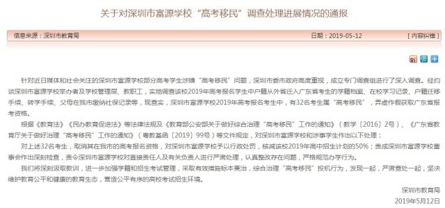 5月12日晚,深圳市教育局發(fā)布《關(guān)于對(duì)深圳市富源學(xué)?!案呖家泼瘛闭{(diào)查處理進(jìn)展情況的通報(bào)》,通報(bào)稱(chēng),經(jīng)查實(shí),深圳市富源學(xué)校2019年高考報(bào)名考生中,有32名考生屬“高考移民”,弄虛作假獲取廣東省報(bào)考資格。按照相關(guān)法例,對(duì)涉事32名學(xué)生取消在深圳市的高考報(bào)名資格,對(duì)深圳市富源學(xué)校予以行政處罰,核減該校2019年高中招生計(jì)劃的50%;責(zé)成深圳市富源學(xué)校董事會(huì)作出深刻檢查,責(zé)令深圳市富源學(xué)校對(duì)直接責(zé)任人及有關(guān)負(fù)責(zé)人進(jìn)行嚴(yán)肅處理,認(rèn)真整改存在問(wèn)題,嚴(yán)格規(guī)范辦學(xué)行為。