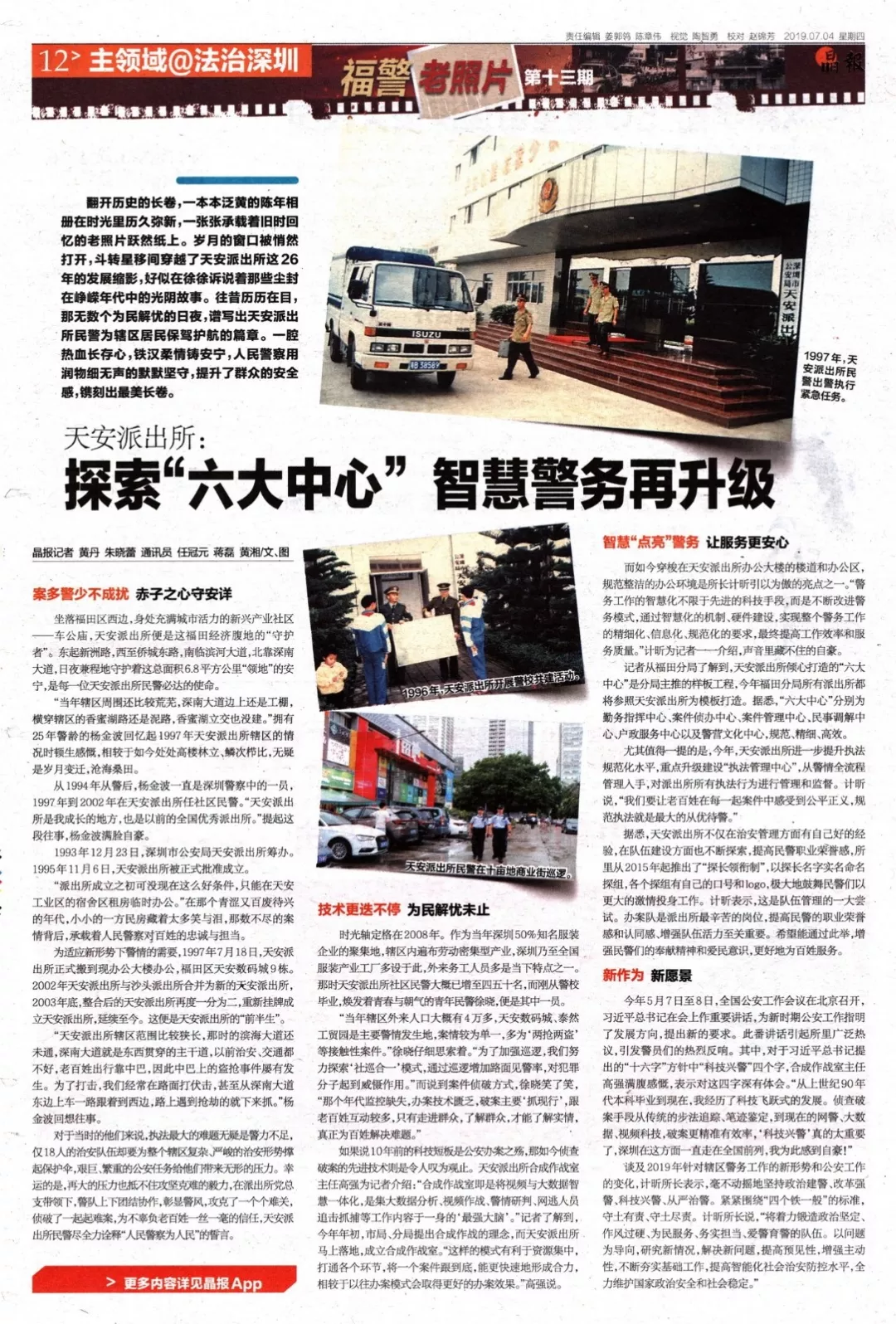 新作為新愿景今年5月7日至8日,全國公安工作會議在北京召開,習近平總書記在會上作重要講話,為新時期公安工作指明了發(fā)展方向,提出新的要求。此番講話引起所里廣泛熱議,引發(fā)警員們的熱烈反響。其中,對于習近平總書記提出的“十六字”方針中“科技興警”四個字,合成作戰(zhàn)室主任高強滿腹感慨,表示對這四字深有體會?!皬纳鲜兰o90年代本科畢業(yè)到現在,我經歷了科技飛躍式的發(fā)展。偵查破案手段從傳統(tǒng)的步法追蹤、筆跡鑒定,到現在的網警、大數據、視頻科技,破案更精準有效率,‘科技興警’真的太重要了,深圳在這方面一直走在全國前列,我為此感到自豪!”