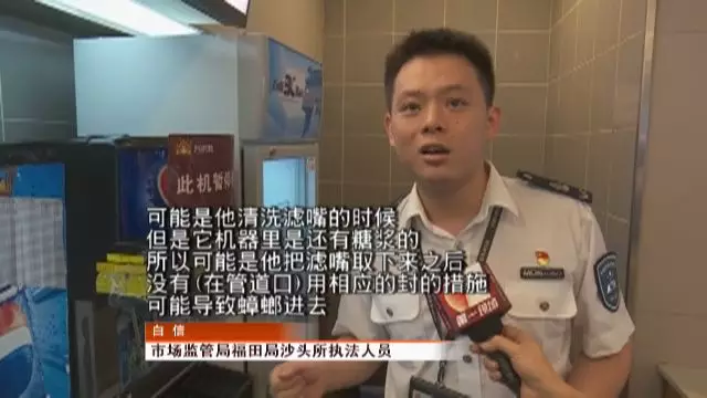 可能是他清洗濾嘴的時候,里面是個管道是空的,但是它機(jī)器里是還有糖漿的。這種糖漿特別容易吸引蟑螂或者異物進(jìn)去,所以可能是他把濾嘴取下來之后,沒有用封的措施,可能導(dǎo)致蟑螂進(jìn)去。然后把濾嘴裝上去 ,再可樂倒出來的時候,可能蟑螂就跟一起出來了 。
