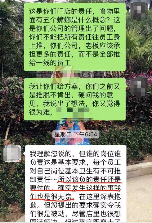 康先生拍了現(xiàn)場的照片,因?yàn)楦糁w,可以看到有多個小黑點(diǎn),但很難一眼辨認(rèn)出是小蟑螂。不過,從康先生提供的微信聊天記錄可以看出,店方承認(rèn)他們員工有疏忽,也派負(fù)責(zé)人跟康先生溝通賠償問題??迪壬硎镜昙以敢赓r償1000元,但他感覺對自己的精神影響很大,并不同意。