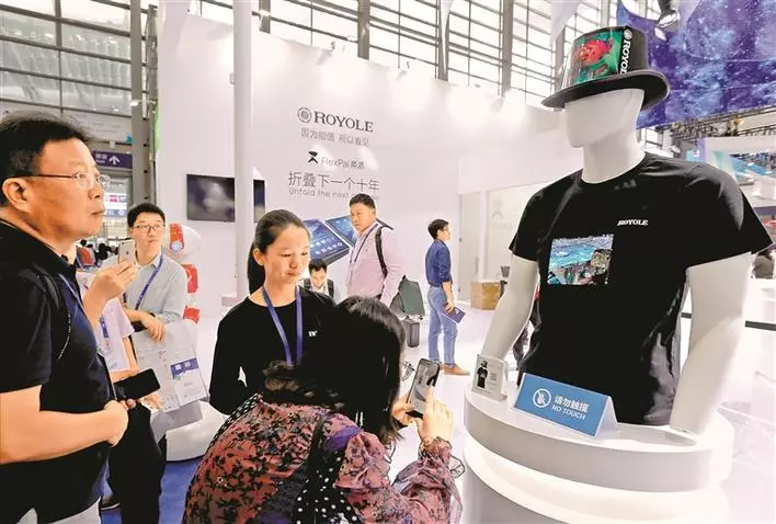 ▲圖為柔宇公司展示可以穿戴在身上的薄膜顯示器。深圳特區(qū)報記者 李偉文 攝