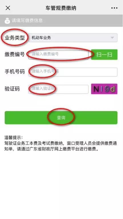 02 業(yè)務(wù)類型選擇【機(jī)動(dòng)車業(yè)務(wù)】,輸入繳費(fèi)編號(繳費(fèi)流水號),填寫本人/代理人手機(jī)號碼、驗(yàn)證碼后,點(diǎn)擊“查詢”。